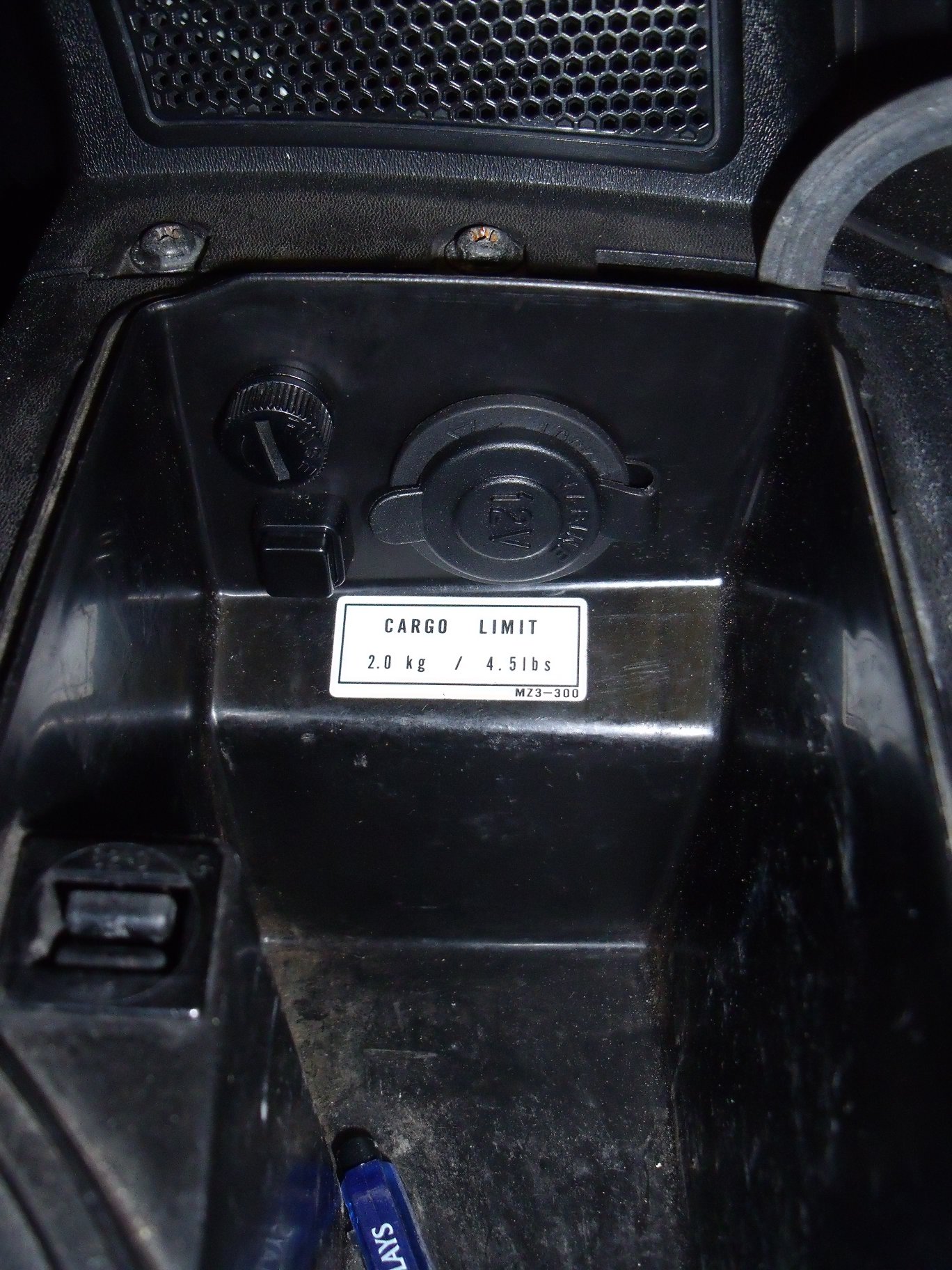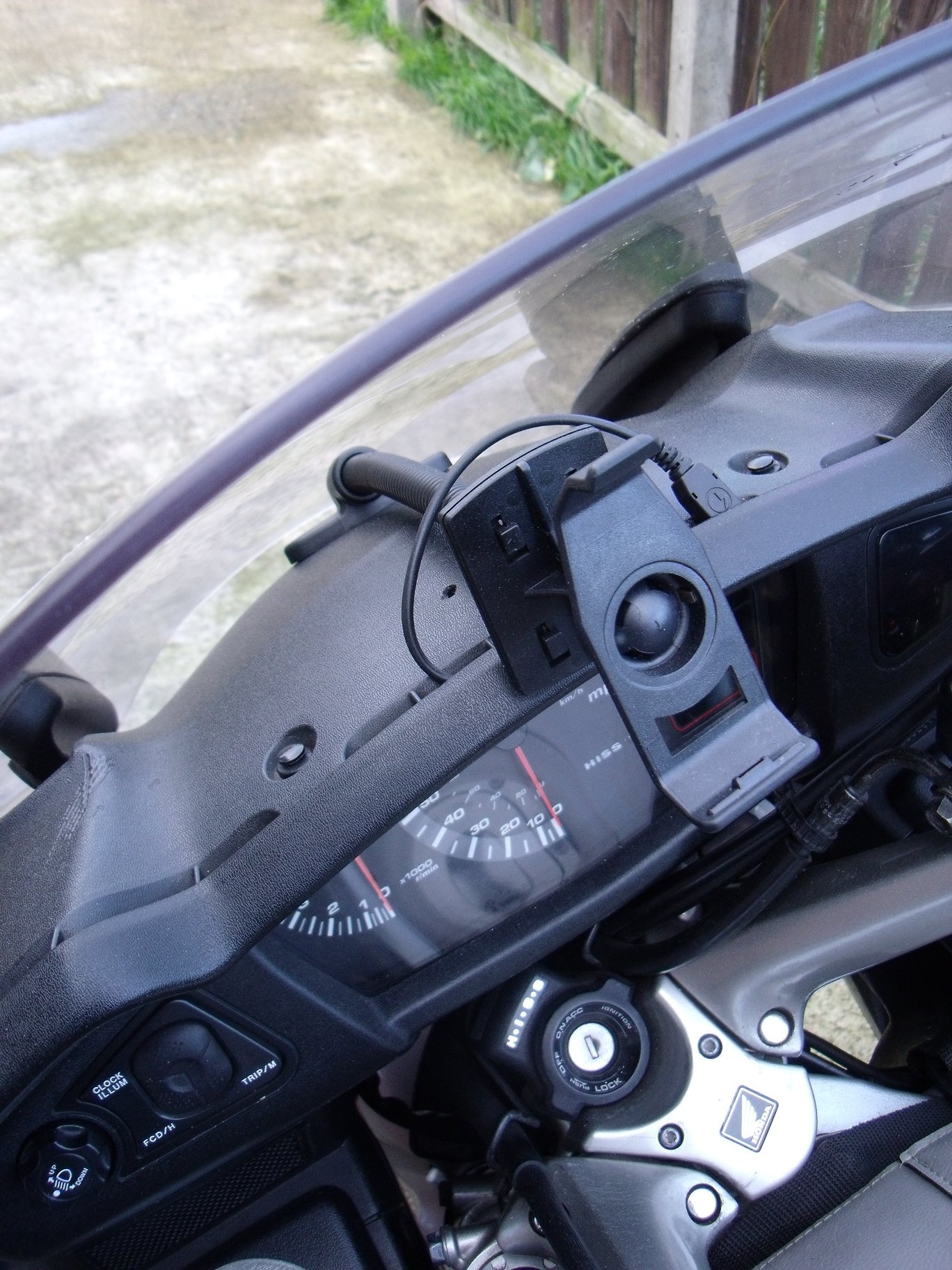 Next up was the power supply for the Nuvi. A full charge lasts a couple of hours at best. The obvious answer would be to fit a cigar lighter socket somewhere so that the Garmin's standard charger could be plugged in. This would make for a messy setup though, with wires getting tangled. On the other hand a cigar lighter socket WOULD be useful to charge the mobile phone. I decided that I'd fit a socket inside the right-hand fairing pocket and a concealed supply for the Nuvi. One of those cheap USB chargers was duly obtained (£6, bizarrely), ripped apart and reassembled into a small plastic box that took up residence under the nose cowling. This supply, together with the cigar lighter socket, were fed from a fuse and on/off switch also concealed in the right-hand fairing pocket. The phone and its charger remain in the pocket, whilst the only visible cable (see above) is six inches or so of satnav power lead that exits the joint between instrument panel and nose cowling. Job done :O) As an aside, the usually-recommended (by Honda) location for the cigar lighter socket is down towards the bottom of the front wall of the storage compartment. That is where it needs to go in order to clear the in-dash speaker units... but who the hell wants loudpeakers on a bike, apart from Goldwing riders, and they don't count...? The drawback to having the socket so low is that whatever you plug in eats into the space at the bottom. By placing the socket higher as I did you get more space and the charger etc. is easier to reach.