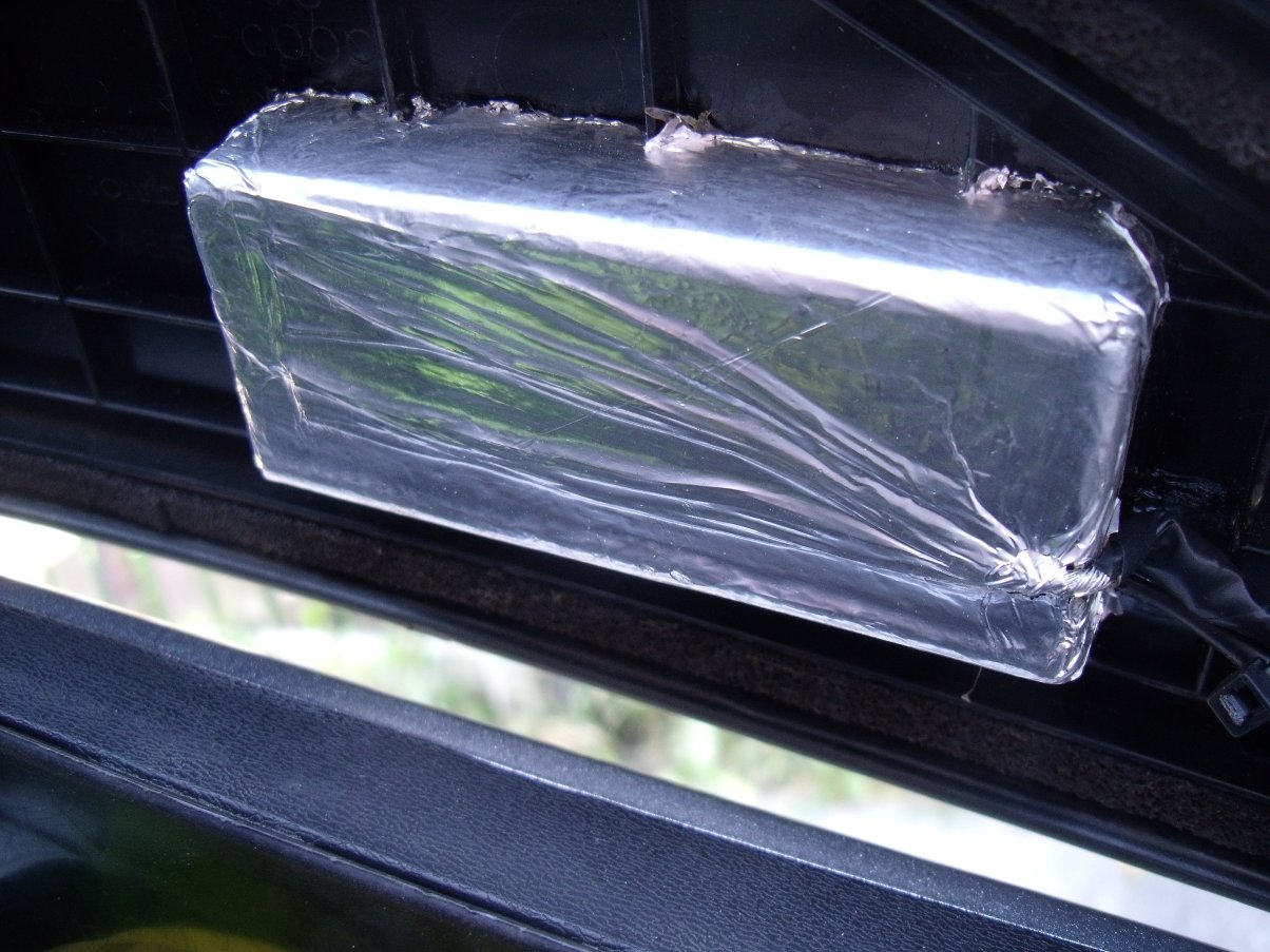 In advance of another trip to the Alps I thought I might try and get to the bottom of the strange MP3 player issue. I tried 2 more Zen players and both suffered the same scrambling effect. I reprogrammed them and tried again, this time with the supply lead unplugged... and it still happened. So the issue would definitely seem to be related to the remote control. As a first fix I tried gluing (or should that be glueing?) aluminium kitchen foil over the electronics box I'd created. The following photo shows this; the ripples in the foil aren't due to careless application, it's the unravelled end of a length of screening braid that is attached to an earth cable to the bike frame.