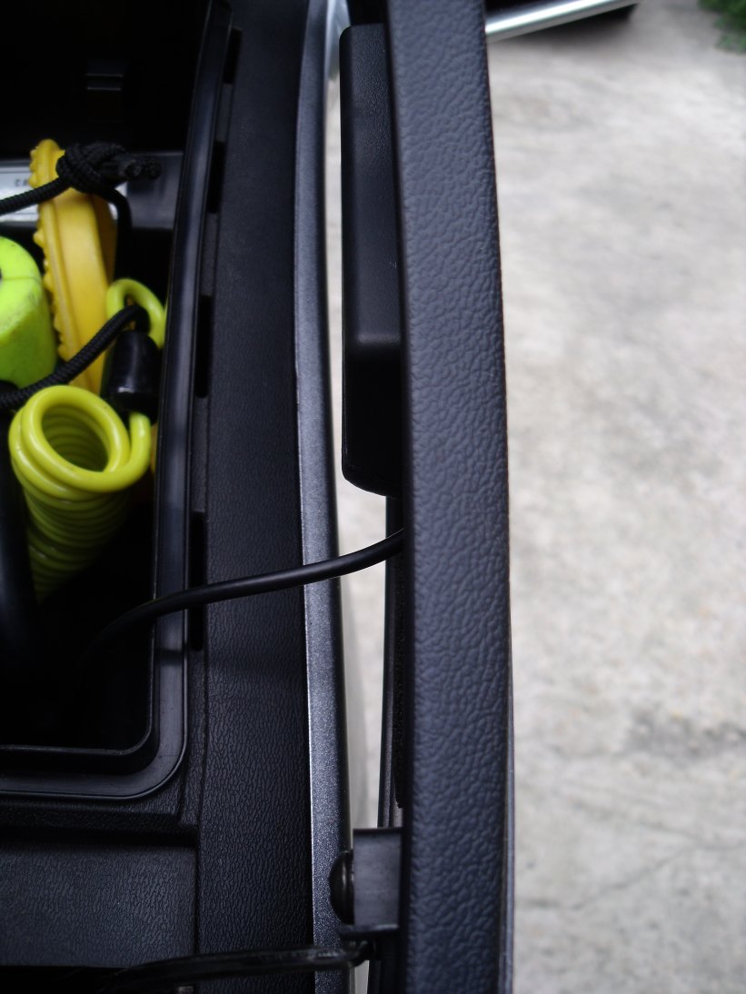 Things are a bit so-so with the MP3 player; the Zen Micro seems to be a bit fussy about vibration, the first I tried having trashed a hard drive for no apparent reason. The next had a random habit of ignoring the settings and turning itself off... not battery related as the thing has a permanent DC supply. The third one works fine, so far. Luckily they're cheap enough on Ebay :D Here's the wired remote control hanging out of the glovebox (tape is holding front panel on until I find some glue!) :