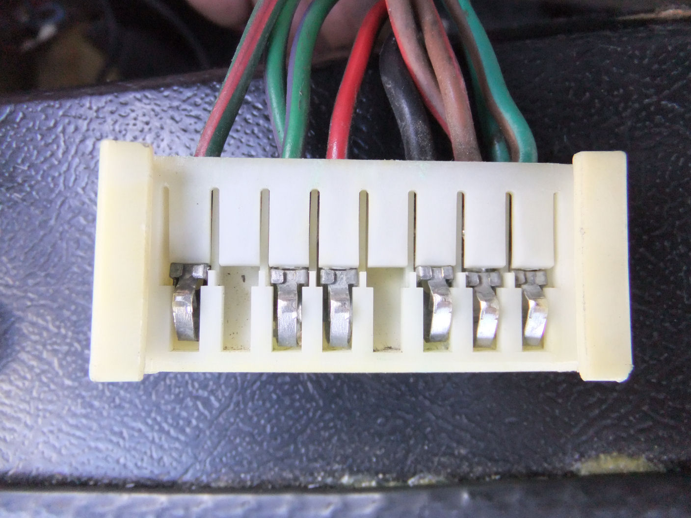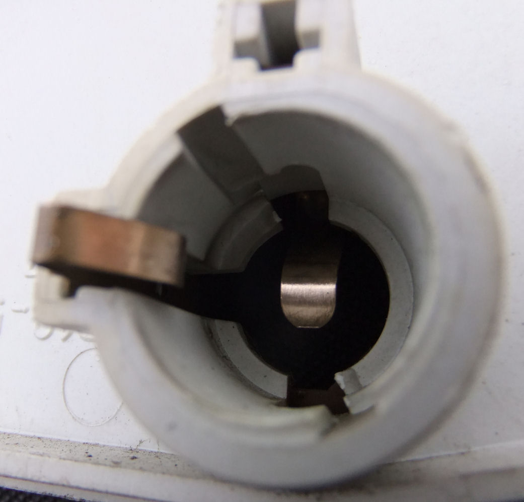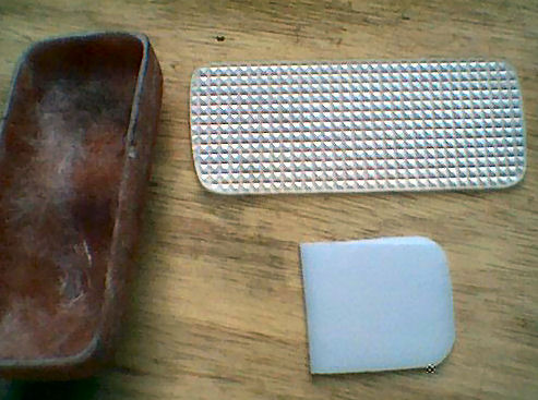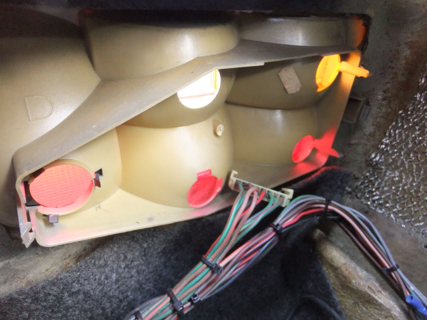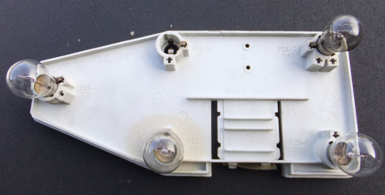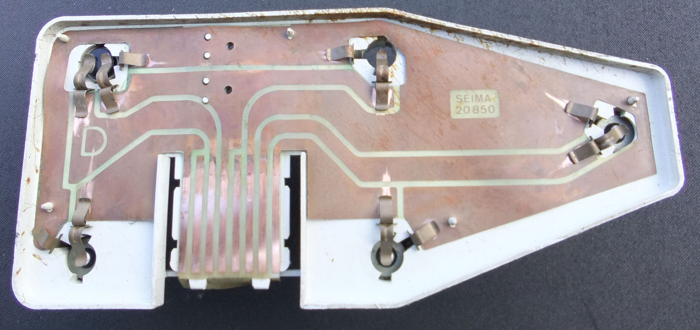 ...and the finished item prior to drilling for screws (ignore the spoiler damage!) The rear lamp clusters changed over the life of the TVR wedges: initially from the Ford Capri, they were superceded (or superseded if you prefer; I'm never sure what the point of creating words is if you then let someone change the spelling...) by those from the Rover SD1 (well, they robbed plenty of other bits from it as well, so why not) and then, in a blaze of modernisation (which sounds like an Americanism!), the rear lamps from the Renault Fuego were fitted, which required a bit of GRP work to make them a flush fit (and the better the car looked as a result). The Fuego units are actually installed upside down, so the nearside becomes the offside and vice versa (which is Latin, or as near as damn). At the time, electronics were just starting to become important in mainstream cars (previously, the AM radio or the bimetallic flasher unit for the indicators were about as techno as it got) and the Fuego lamp units, along with other Renault installations at the time, were designed for easy maintenance (or so they thought). The lamps are bayonetted into sockets formed as part of a detachable back plate which unclips from the lens housing. Each lamp socket has copper contacts which are pressed-in to the backplate and retained by barbs. The 'fingers' of each contact then press against a flexible membrane 'circuit board' arrangement which has the necessary copper tracks printed on it. Each of the tracks is led to one edge of the 'circuit board', onto which slides the car's wiring loom connector. So to change a bulb, you access the interior of the lamp unit, unclip the backplate, lift it away from the lens unit and there are your lightbulbs. Unfortunately the design has a couple of flaws - well, one main flaw really: as both the lamp socket terminals and the loom connector rely on a combination of 'spring' and friction to keep them in good contact with the membrane, as time goes by both the contacts and the circuit tracks oxidise and this leads to poor connections. You can detach the loom connector by simply sliding it off the backplate, when both the tracks and the contact 'fingers' of the loom connector can be brightened-up by suitable means... I prefer a fibreglass pencil, beloved of electronics techies the world over. It removes cack without removing appreciable amounts of copper, which can't be said of emery boards, sandpaper or files. The contact 'fingers' of the actual lamp sockets are a bit trickier; you can, with care, extract their barbs from the backplate and then clean up the contacts as well as the exposed area of circuit track. It should also be possible to slip a bit of fine wet'n'dry paper between the finger and the track and clean up both, but proceed carefully so as not to unduly bend the 'finger'. Here's the backplate from the Fuego lamp showing the lamp sockets: ...and the other side with the copper tracks and socket spring 'fingers' (the letter 'D' is for 'droite', this being the right-hand unit from the Fuego, but fitted upside-down on the left of the TVR. The other unit obviously has a G...): Close-up of the fingers inside one of the lamp sockets: ...and the contacts in the loom connector: This is the rear view of the lamp unit with the backplate removed (the silver mesh at right is the radio aerial's groundplane, glued to the inner wing):