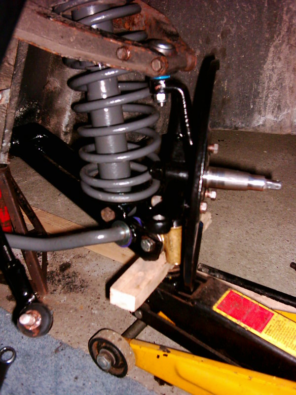 In the photo below, showing the suspension being rebuilt, note that the upper wishbone legs are still rusty. This is because I was keen to get the car back together, and I suspected I'd have to destroy the upper wishbone pivots to get them out. In the event, a couple of weeks later I found a brand new pair of pivots on Ebay for next to nothing, so when I get bored, the front suspension will have to come apart again...! You can make out the purple polyurethane anti-roll bar end bushes, new trunnion and upper balljoint. I re-used the track rod ends but managed to blag some new rubber boots for them as the old ones were perished.