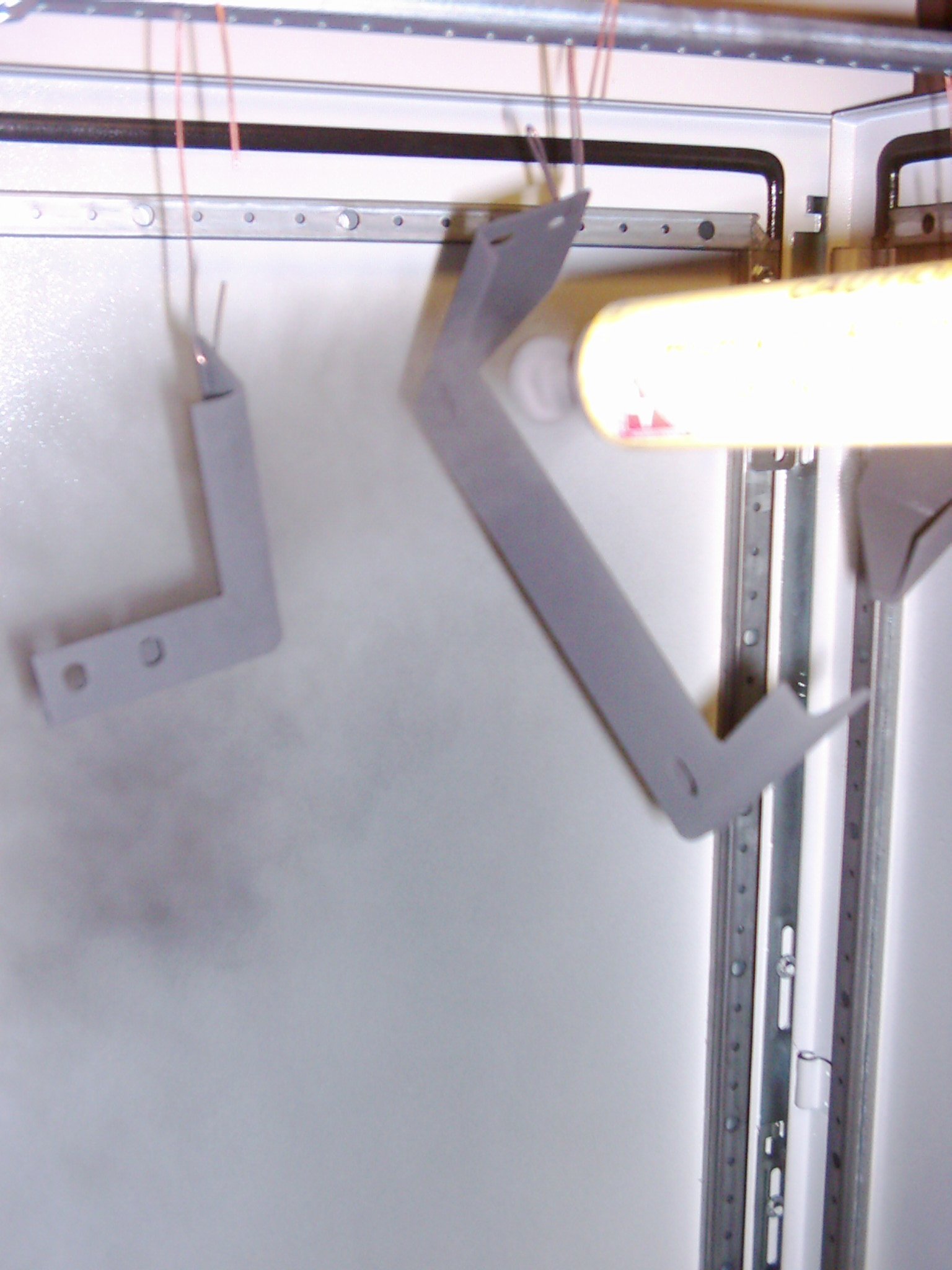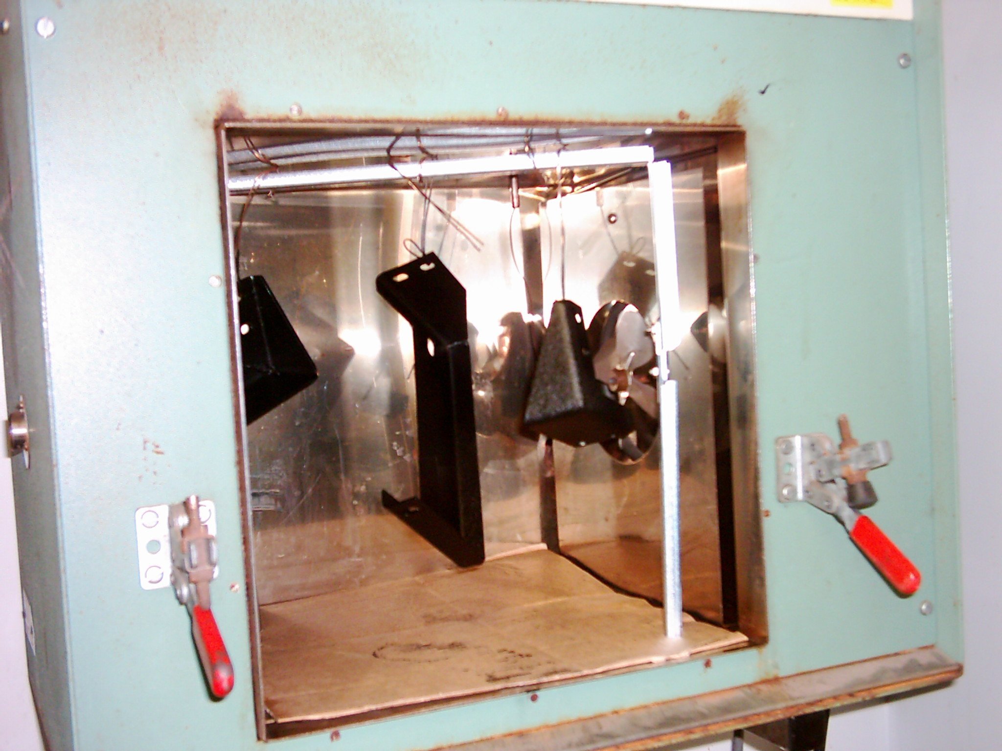 Dipstick: powder or paint? Right, so I had a pile of bits stripped off the Lotus. Some were alloy and were cleaned up in the bead blaster. What about the steel bits though, those rusting chunks dragging down the appearance of Hethel's finest? :-D Sandblast, that's what was called for. I cleaned up the oil cooler mounting brackets and the coolant expansion tank plus its mounting bracket. The expansion tank was that rusty I fully expected the sandblast to blow holes in it, but although it was pitted to hell it was still sound. I could have just slapped some Smoothrite on; that would have been my preferred finish in the past. Now I have powder-coating, of course, and I'm gonna use it! There's no room at home to build any kind of 'spray booth', and the makers of the PC kit advise against using the domestic oven to bake the parts as the fumes could be detrimental to your Sunday roast, apparently. So I knocked up a sort of wind shield at work from spare Rittal cabinet doors, and we have a small oven used for calibrating equipment, drying PCBs etc that was JUST big enough to hold the Lotus' expansion tank. I built a framework to support small brackets inside the oven. Here's the coolant tank hanging (for demo purposes) in the 'windshield'... We have a small compressor at work that's more than able to supply the air demand of the PC 'gun', so with a few PCL adapters, small-bore hose and a spare moisture trap/ regulator I was soon set up. I pre-heated the parts in the oven to boil off any moisture in the pits, then degreased the parts with isopropyl alcohol. The powder hopper was half-filled with satin black powder and the fun began! I started with the various brackets, sprayed what I thought was a liberal coating of powder on and then gently wiggled the hanging frame into the oven. Fifteen minutes or so at 180 degrees and I took them back out... and found that they were a bit patchy. Hmmm. Oh well, not a problem, it's possible to re-coat (in fact three days later I did just that). Looks grey due to flash, but it's satin black, honest... On to the expansion tank. This time I upped the airline pressure and threw more powder about. Into the oven, give it 15 minutes and... yeah! That's more like it! The coating is nice and even, slightly textured, though not as thick as I thought it would be (or as thick as it normally is from the professionals) but I'm sure a bit more experimentation will resolve that. For now, at least these parts won't go rusty while they lie around waiting for installation... In the oven... UPDATE 11/11/13... I didn't use the powdercoating system for several years after the Esprit was sold but recently I dug it out and used it to coat the rear springs from the TVR, more information can be seen here. |
